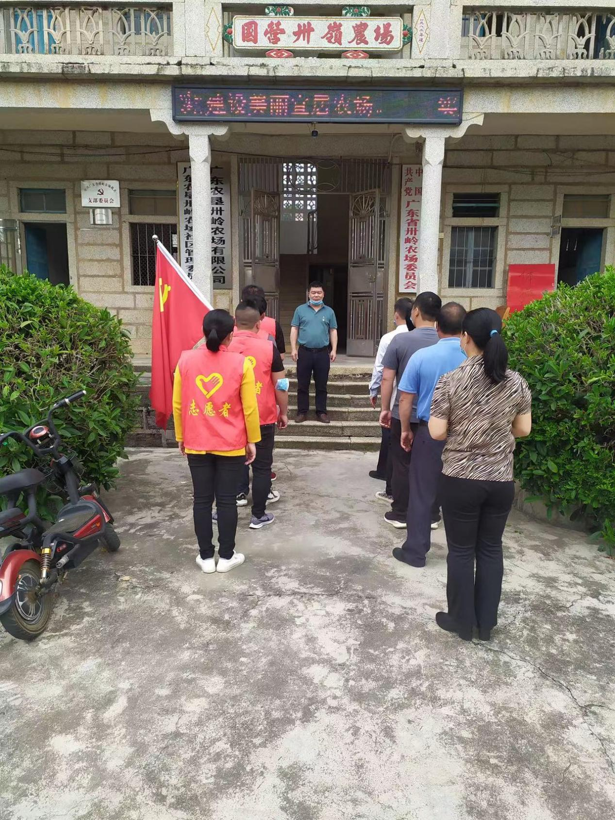 卅岭农场组织党员疫情防控志愿队到新兴小区、新旺小区开展“擎旗筑堡垒、亮徽当先锋”活动,发放《致卅岭农场全场居民一封信》150张,检查登记来往人员的粤康码,入户走访群众疫苗接种情况83户,充分发挥战斗堡垒和先锋模范作用。