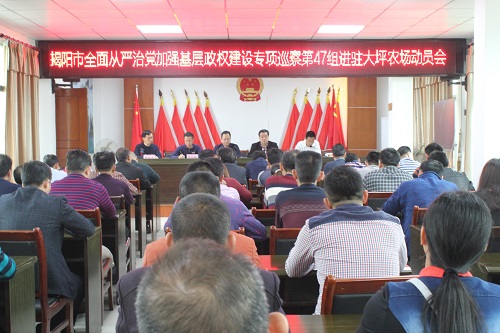 为深入贯彻落实揭阳市委六届六次全会精神,揭阳市全面从严治党加强基层政权建设专项巡察组将进驻普宁各乡镇场街道,对普宁市28个乡镇场街道568个村(社区)党组织(延伸到村民小组)开展为期三个月的全面从严治党加强基层政权建设专项巡察。2019年3月19日,揭阳市全面从严治党加强基层政权建设专项巡察第47组组长吴振旭带领其他成员共3人进驻大坪农场。3月20日上午,大坪农场召开市全面从严治党加强基层政权建设专项巡察工作动员会议,会议由场党委书记官锦周同志主持,参加会议的人员有揭阳市委专项巡察组全体同志,普宁市挂钩大坪农场领导,场机关全体干部职工、村(社区)“两委”成员、乡贤咨询委员会代表及村民代表等40多人。